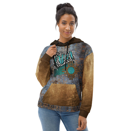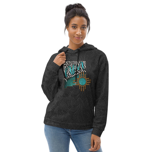 NM Midnight Heritage Hoodie – Turquoise Zia Symbol on Black Southwest Pattern | New Mexico Pride | Unisex Fit