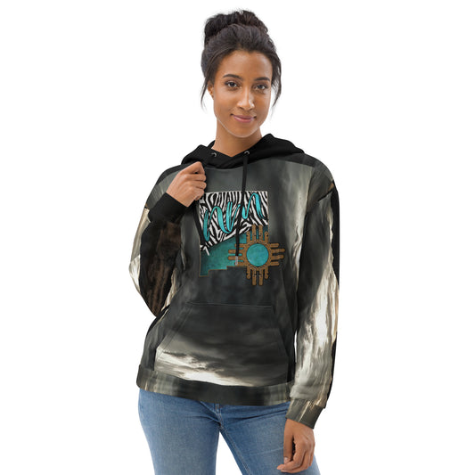 NM Thunderstorm Hoodie – Monsoon-Wash Tie-Dye with Turquoise Zia | New Mexico Unisex Pullover | Zebra NM Lettering